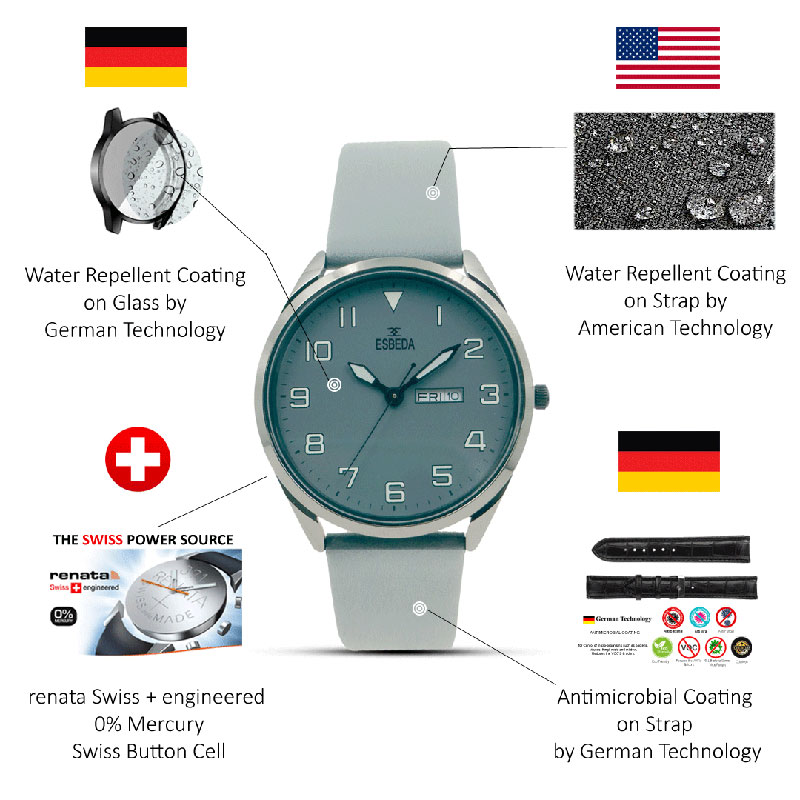 - Designed Leather: Traditional watch straps are composed of genuine leather, as well as having ANTIMICROBIAL COATING BY GERMAN TECHNOLOGY and WATER REPELLENT COATING BY AMERICAN TECHNOLOGY applied to the strap. Our genuine leather straps get softer and more elastic with usage.