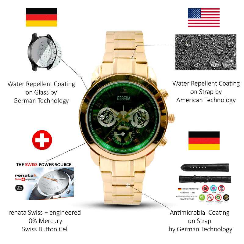 - Bracelet Made of Steel: Use stainless steel bracelets that are brushed, polished, or plated, as well as ANTIMICROBIAL COATING ON STRAP BY GERMAN TECHNOLOGY and WATER REPELLENT COATING ON STRAP BY AMERICAN TECHNOLOGY, to dramatically alter the appearance of your favourite watch.